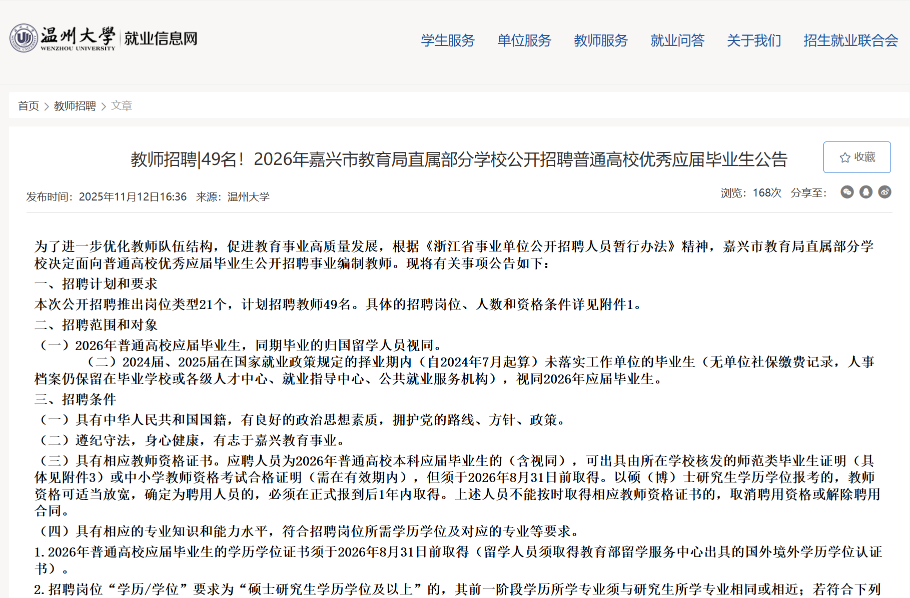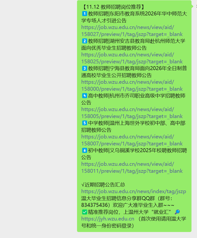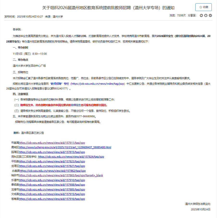 每年秋季,各省市学校会启动教师招聘提前批工作。为此,学研部系统收集并整合温州市鹿城区、瓯海区等各区县的提前批教师岗位信息,通过一篇统一的公告进行发布。此举旨在为即将举办的招生就业联合会专场招聘会提供统一的信息,同时帮助同学们及时获取有效就业信息,实现人才与岗位的高效对接,为就业提供有力支撑。