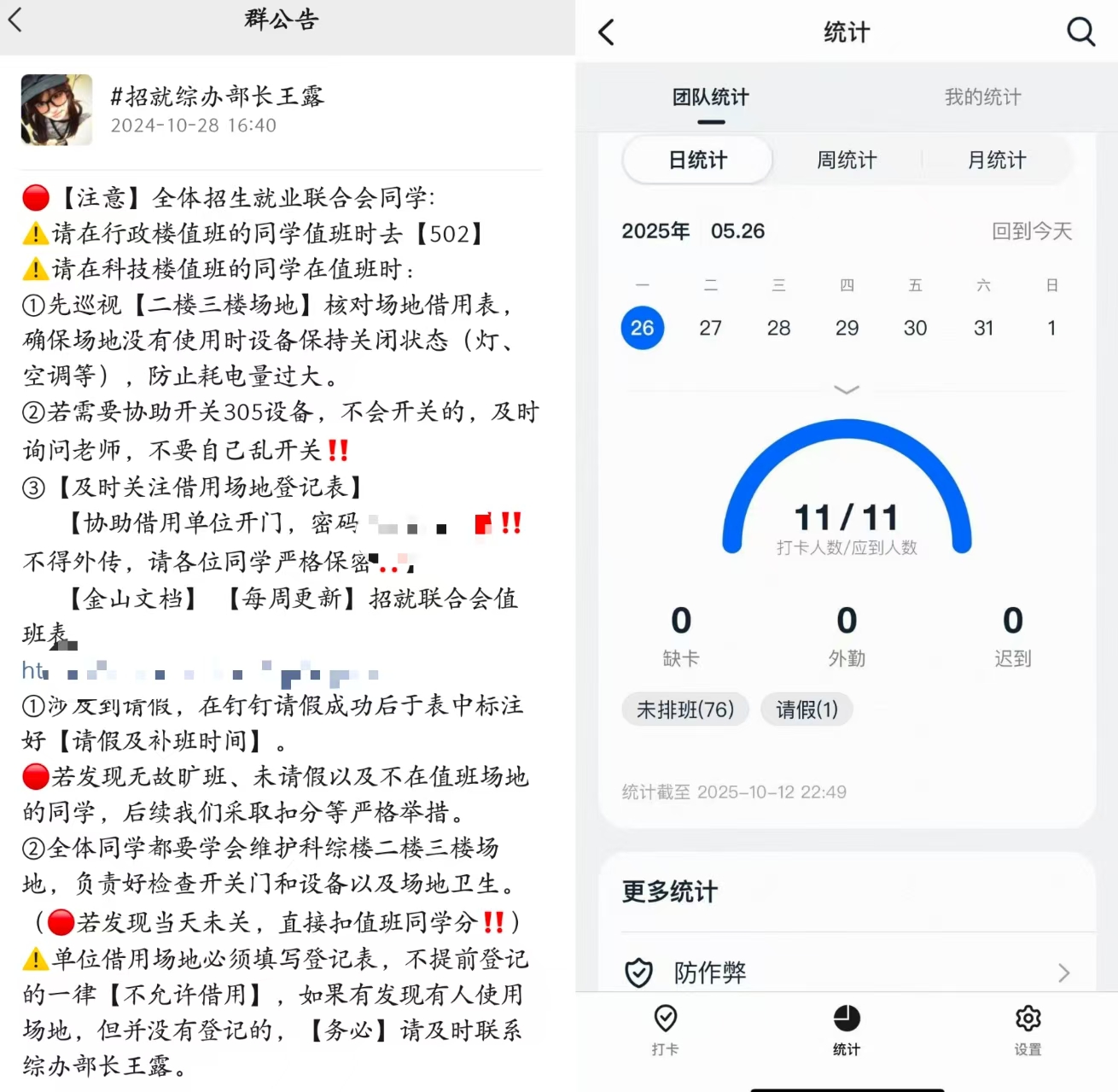 “没有规矩不成方圆”,本学年综合办公室进一步完善考勤制度:利用 “钉钉” 平台实行值班打卡签到,同步在共享表格汇总请假情况,实现 “打卡 -记录-反馈” 全流程监督;每周公示值班加分明细,学期末公示成员总分表,严格落实值班要求,保障日常工作有序运转。